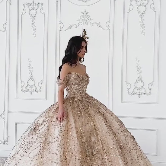 Celebrate your Quinceanera in style with our enchanting off-the-shoulder ball gown—a dreamy fusion of elegance and charm that will make you feel like royalty on your special day. The layered tulle full skirt, adorned with delicate gold glitter print, adds a touch of magic to every twirl, creating a mesmerizing silhouette fit for a princess. The dimensional floral applique on top of the glitter motif bodice adds an extra layer of whimsical beauty, capturing the essence of romance and fantasy. With a lace-up corset back closure, this gown ensures a perfect fit that accentuates your curves and flatters your figure. Let your inner princess shine as you dance the night away in this exquisite masterpiece, creating memories to cherish for a lifetime.