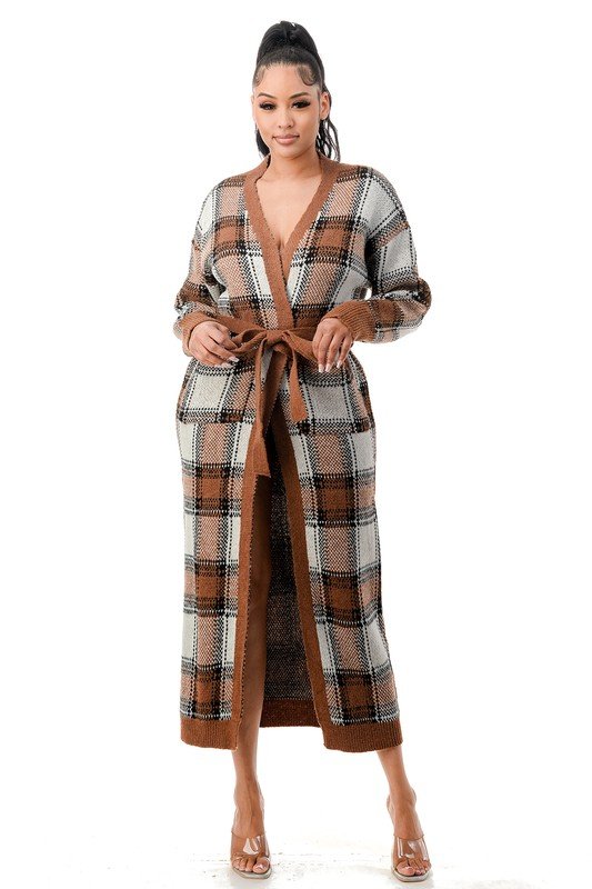 Wrap yourself in timeless elegance with our Plaid Cardigan Sweater. The classic plaid design adds a touch of sophistication while the convenient pockets provide practical benefits. Made with the finest materials, this luxurious sweater will elevate any outfit and keep you warm and stylish all season long.